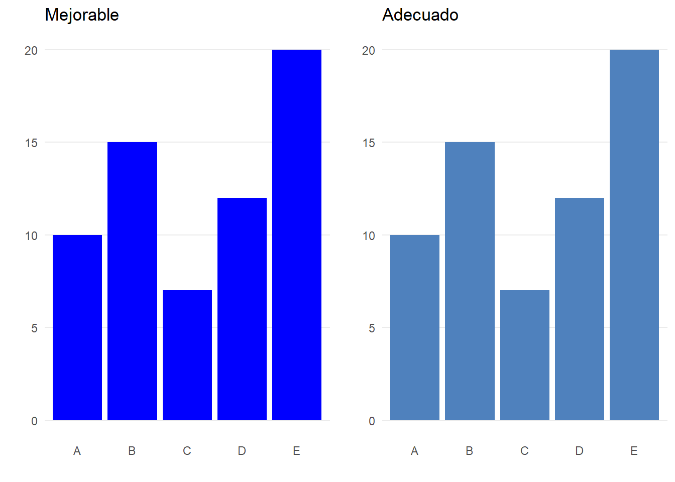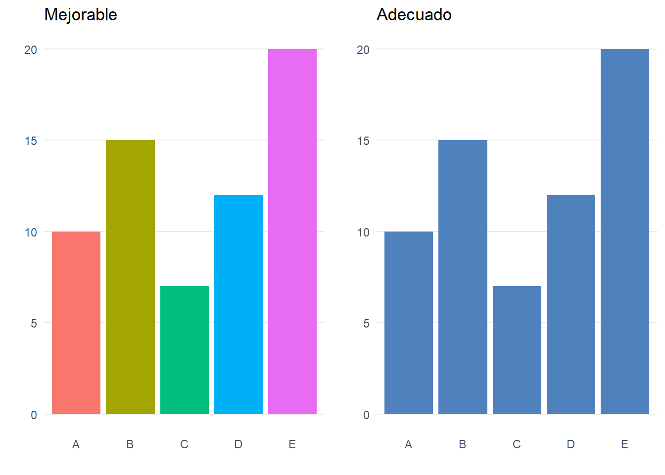 El uso de demasiados colores puede generar confusión y saturación visual. Si tenemos que escoger un solo color, Cole Nussbaumer Knaflic (Knaflic 2015) nos recomienda emplear el azul sobre fondo blanco. Se imprime bien en blanco y negro, y evita problemas a personas con daltonismo (véase Figura 8.1).