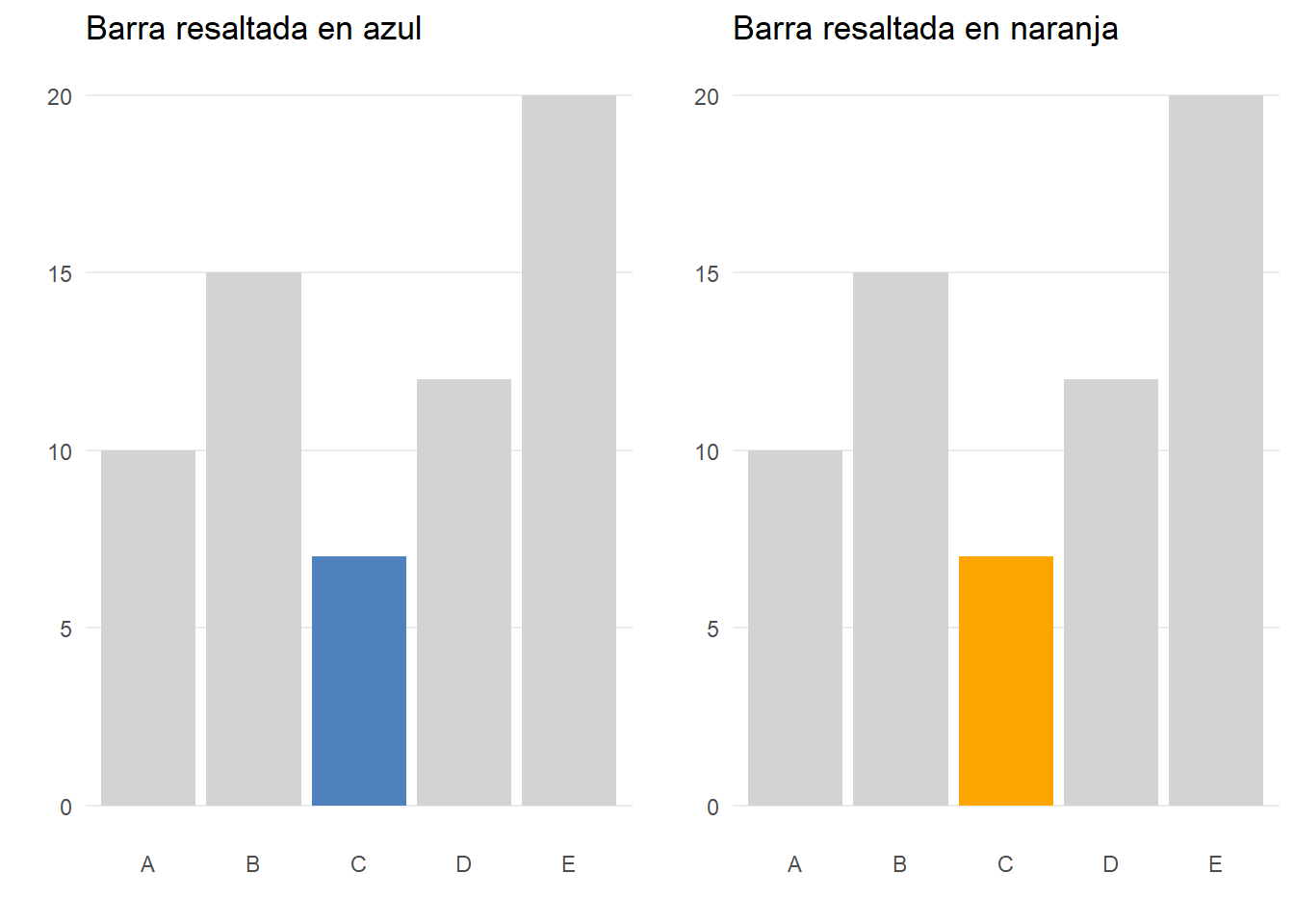 El uso de colores debe ser siempre intencional para cumplir su propósito de manera efectiva. No se trata solo de hacer que el diseño se vea atractivo, sino de usar los colores como herramientas para guiar la atención del espectador y resaltar la información más importante. Cada color debe elegirse con un propósito específico en mente: destacar datos críticos, diferenciar categorías o grupos, o crear contrastes que mejoren la legibilidad. La Figura 8.4 emplea para resaltar un dato una paleta de dos colores: un gris como color base y un azul o un naranja como color para enfatizar.