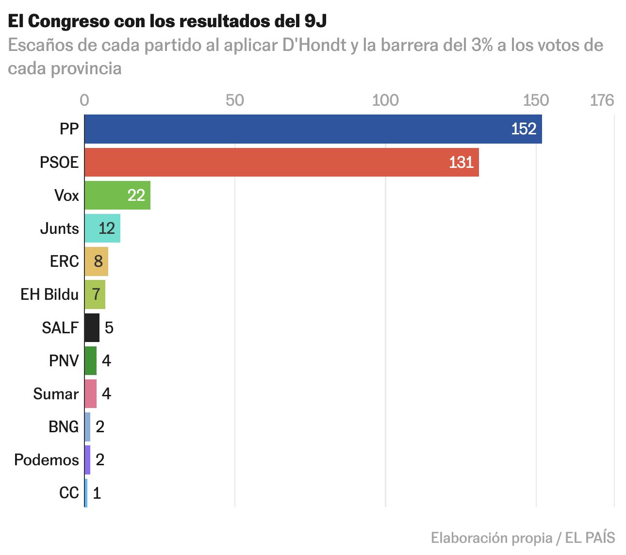 No es ni mucho menos la única alternativa. De hecho, es posible que la elección del color tenga que ajustarse al diseño corporativo o que tenga sentido emplear colores que representen a las entidades involucradas en la visualización. Por ejemplo, el color de las barras de la Figura 8.2 se corresponde con el color corporativo de cada partido político representado. En este caso el uso de un color para cada barra ayuda a entender el gráfico en vez de confundir —como ocurría en la Figura 8.1—.