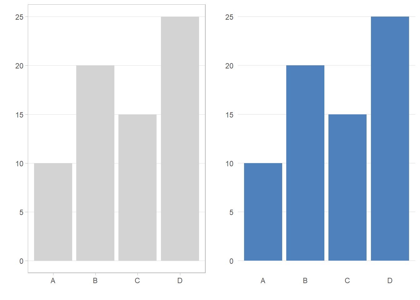 El primer consejo es eliminar bordes innecesarios. Los bordes alrededor de las gráficas a menudo son visualmente pesados y no aportan valor informativo tal como se ilustra en la Figura 7.1.