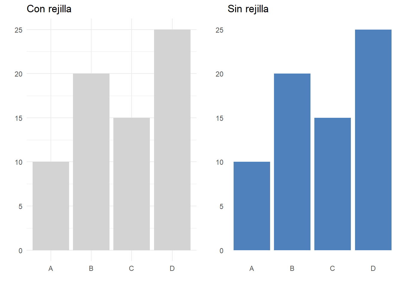 De igual manera, reducir, o incluso eliminar, las rejillas puede mejorar la legibilidad de la gráfica. Las rejillas son útiles en algunos casos para guiar la interpretación, pero un exceso de líneas puede convertir el gráfico en un laberinto visual. Eliminar las rejillas o hacerlas más tenues es una buena forma de reducir la saturación. Si bien es importante que el espectador pueda comparar datos, la rejilla no debe robar protagonismo a la información. Observe en la [Figura @ fig-rejilla] la diferencia entre la misma gráfica con y sin rejilla.