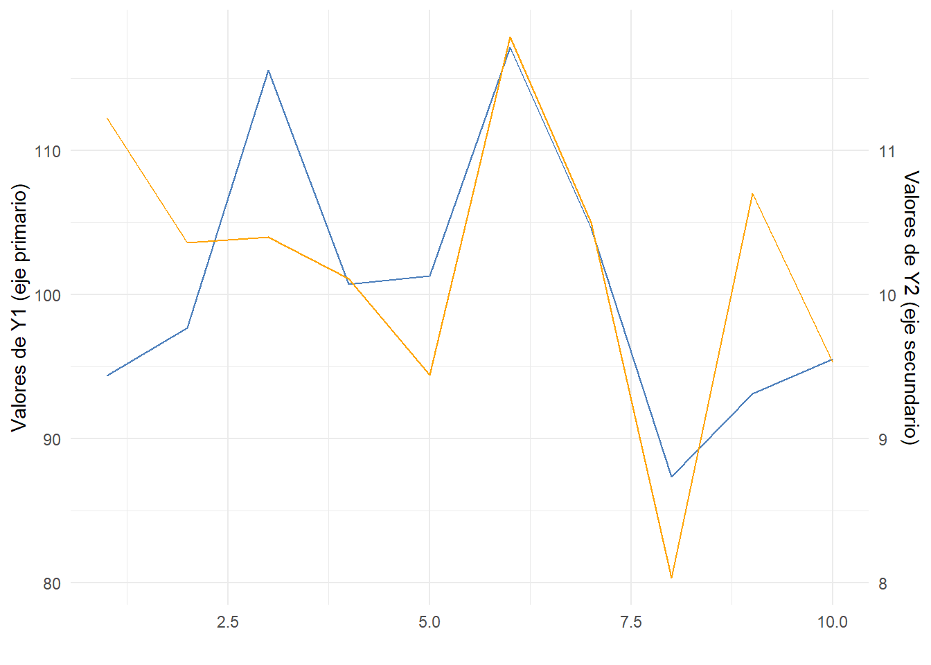 Finalmente, es altamente recomendable evitar gráficos que utilizan más de un eje Y, también conocido como eje secundario. Estos gráficos son díficiles de interpretar dado que los rangos y escalas de los ejes pueden ser diferentes, lo cual dificulta realizar una comparación adecuada entre las variables, como se puede observa en la Figura 6.5