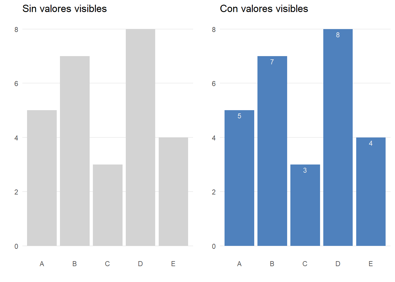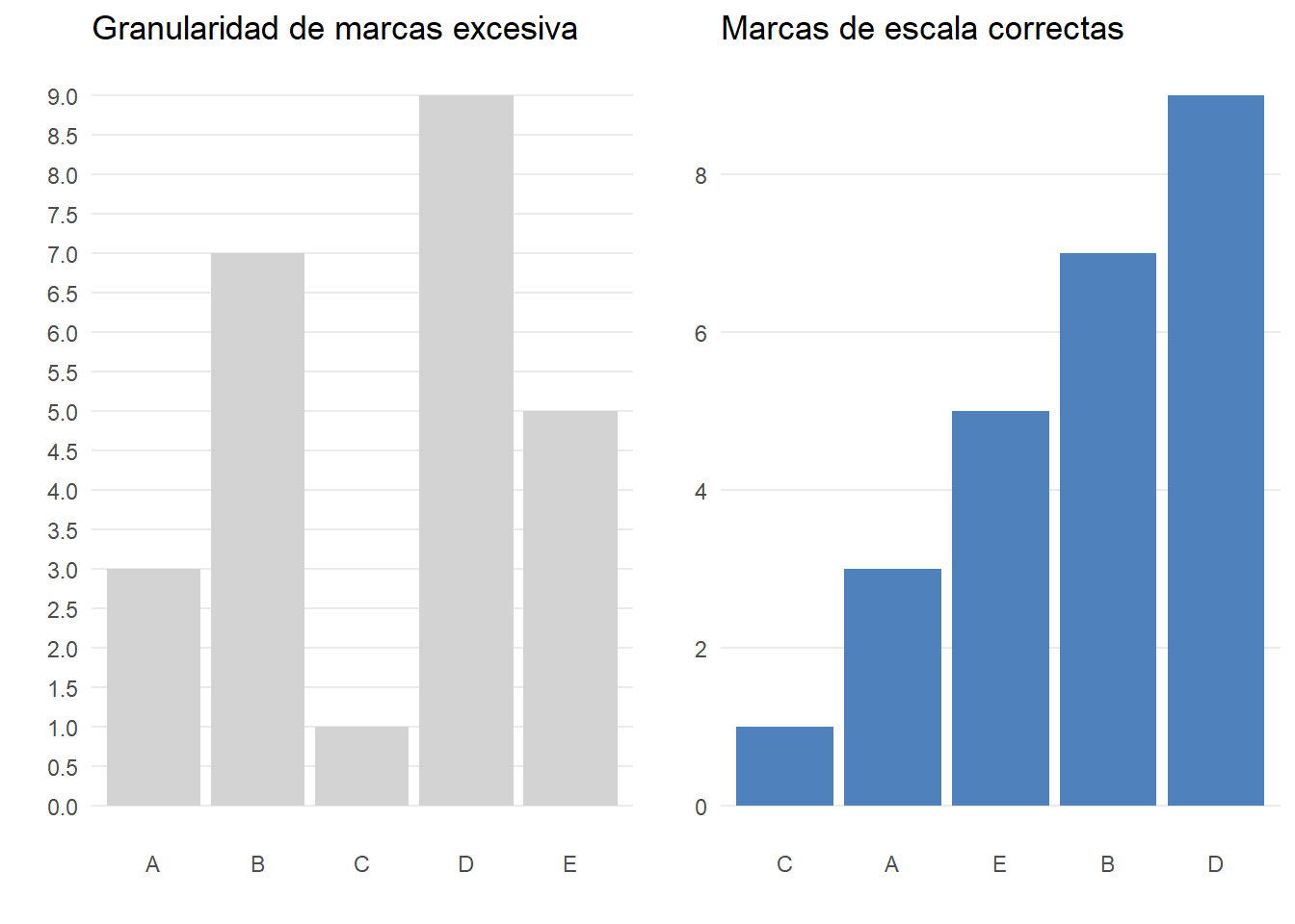 El tamaño de la fuente debe ser suficientemente grande para que sea legible, pero no tan prominente que domine el gráfico. Además, es fundamental garantizar un buen contraste entre los números y los elementos gráficos, de modo que sean visibles sin sobrecargar el diseño. Usa colores suaves para los ejes si los datos deben ser el foco principal, pero que mantengan legibilidad (véase los dos ejemplos de la Figura 6.3).