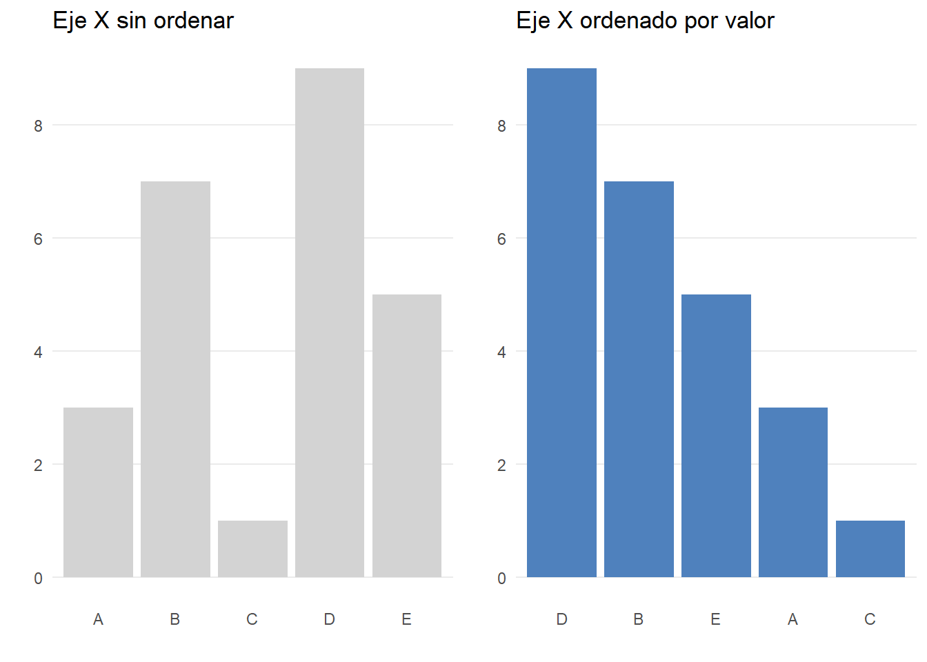 El orden de los valores del eje X se tiene que realizar según algún criterio que facilite la interpretación, ya sea cronológico, alfabético o por magnitud (como es el caso del ejemplo de la Figura 6.1. Un eje X desordenado puede provocar confusión y dificultar la comparación entre los datos.